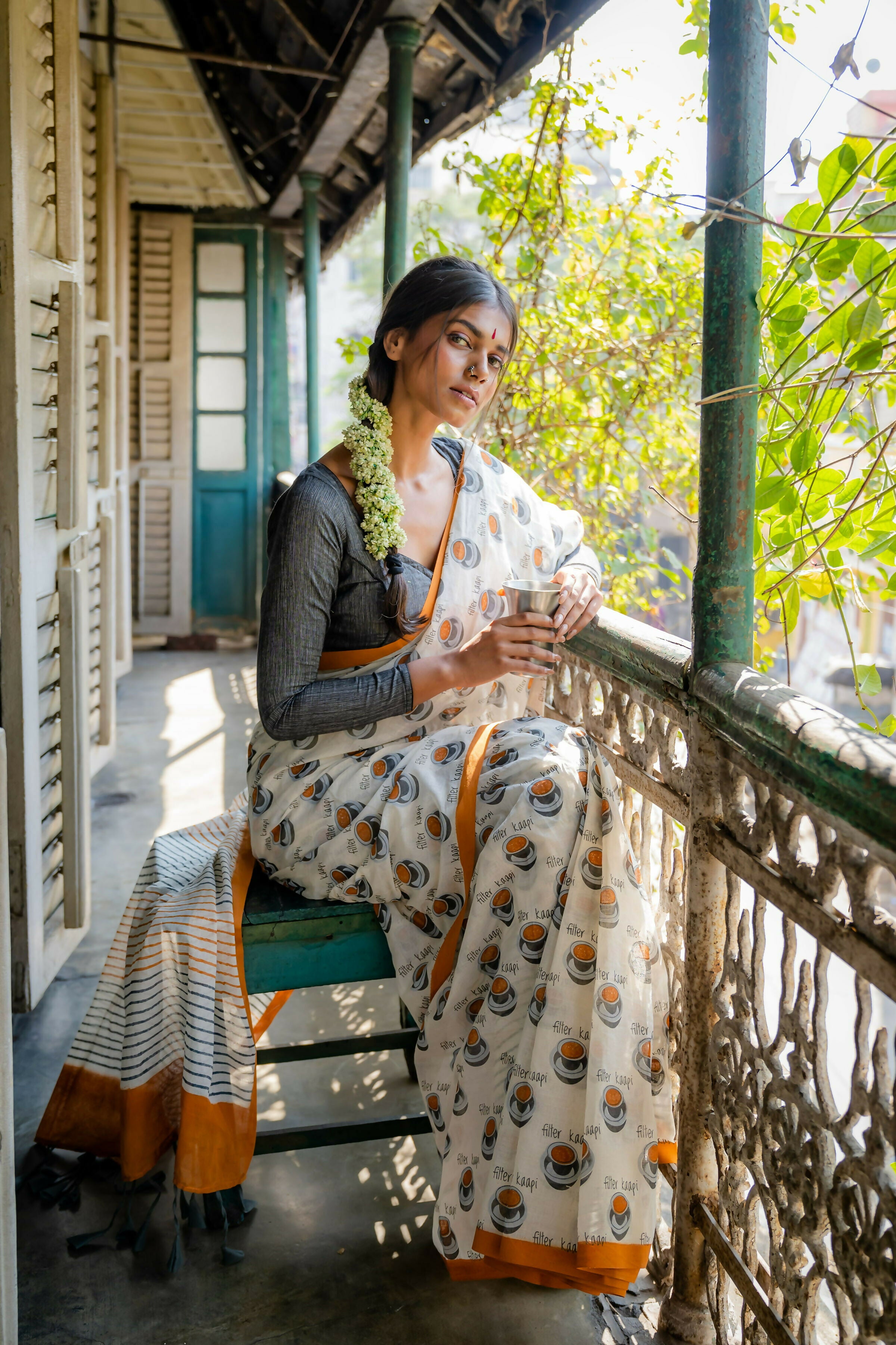 Filter coffee One of the best parts about travelling to the southern part of the country is the Filter Kaapi. This time, we thought of creating something to represent this hot favourite. Find this lovely white screen printed saree with Filter Kapi motifs throughout. We hope you love it as much as we love Filter Kaapi, both in our glasses and on our sarees.